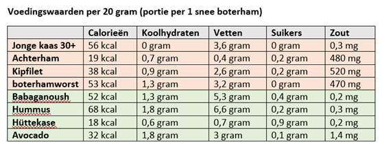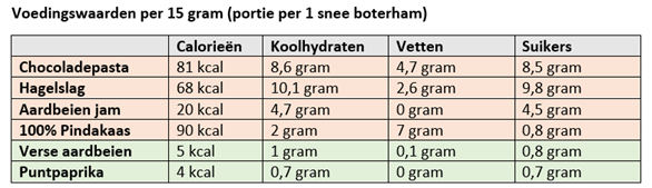 Dagelijks eten we boterhammen, broodjes of crackers met beleg. Als je een Zoetekouw bent zal er al snel hagelslag, chocoladepasta of jam op je boterham liggen. Deze zoetigheden zijn niet bepaald gezond. Deze producten bevatten ontzettend veel verzadigd vet, suiker en koolhydraten (zie onderstaande tabel).