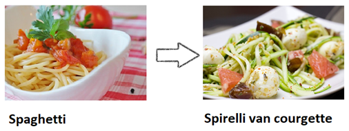 Een gezondere keuze is om dan spaghetti te vervangen door spirelli van courgette (of wortel, komkommer of andere groenten). Met een