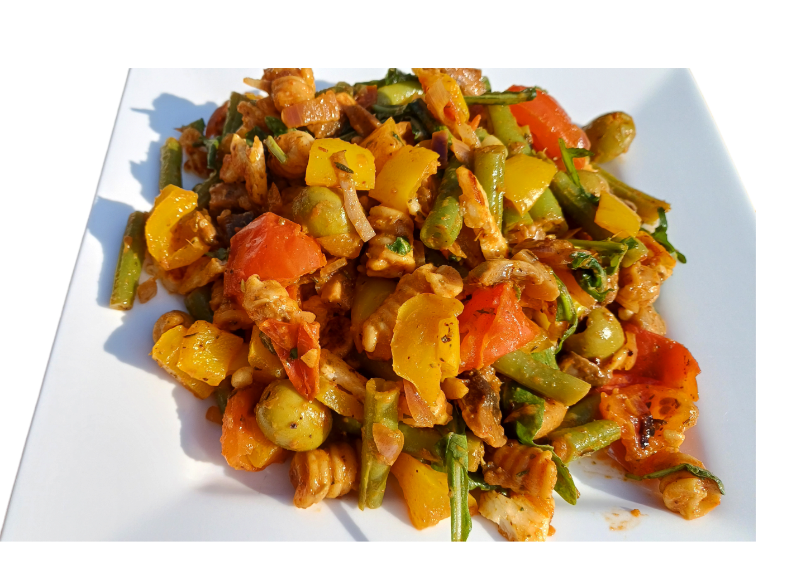 - Doe de groenten en sperziebonen met de pasta in een grote pan. Proef of het op smaak is en serveer met de stukjes halloumi.